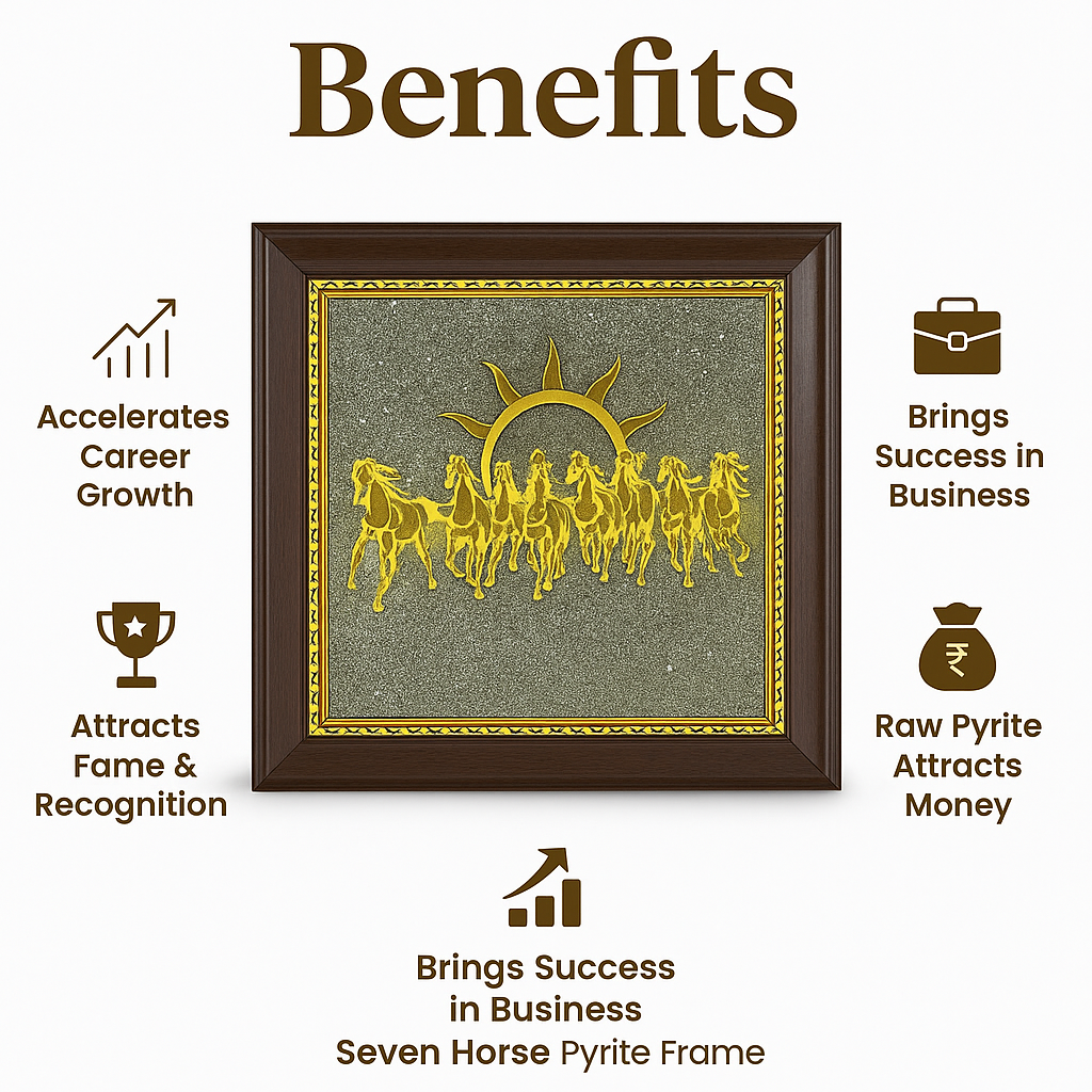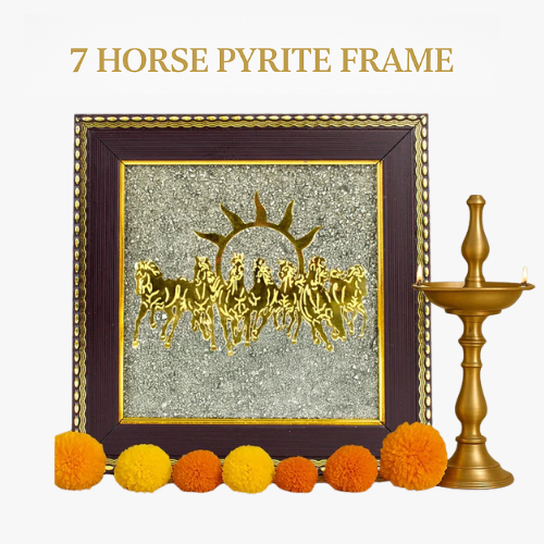 The 7 Horses on Raw Pyrite Frame by Astroindia is a beautifully crafted prosperity enhancer designed to bring rapid growth, victory, and financial abundance into your space. Seven running horses represent strength, determination, and continuous forward movement, making this frame ideal for anyone seeking career advancement, business expansion, or overall success. The base of natural raw pyrite amplifies this effect with its strong Money Magnet energy, helping remove financial blockages, boost confidence, and attract new opportunities with ease. When placed in your office, home, living room, or Vastu wealth corner, it harmonizes the environment and enhances the flow of positive energy, supporting steady progress in all areas of life.