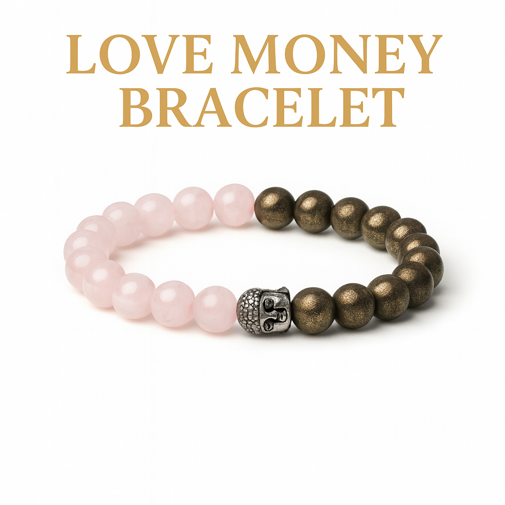 This bracelet is crafted using a combination of natural pyrite and rose quartz crystals. Pyrite is known as a strong wealth-attracting stone, while Rose Quartz supports emotional harmony and positive relationships. Together, they help balance love and financial growth.